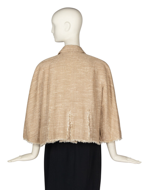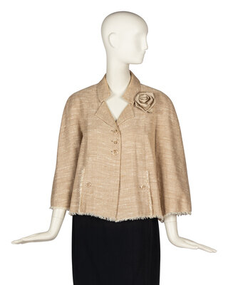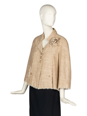 Notch-lapel jacket in a khaki linen-silk blend tweed with wide 3/4 sleeves. Frayed-edge accents. Silk jacquard lining. Includes matching silk camellia pin. From the Spring/Summer 2008 collection, "Nuits d'Été."