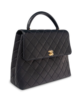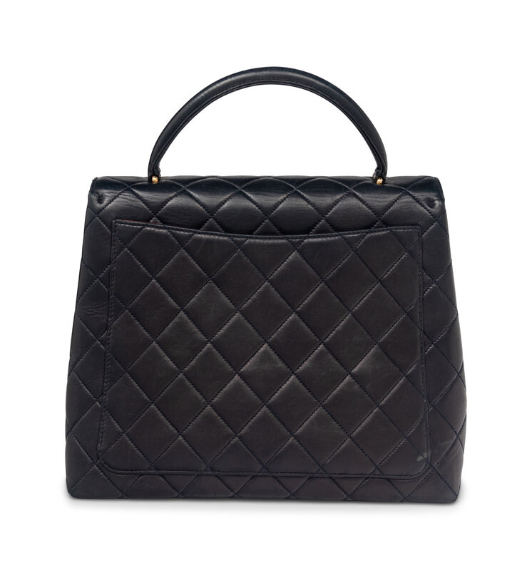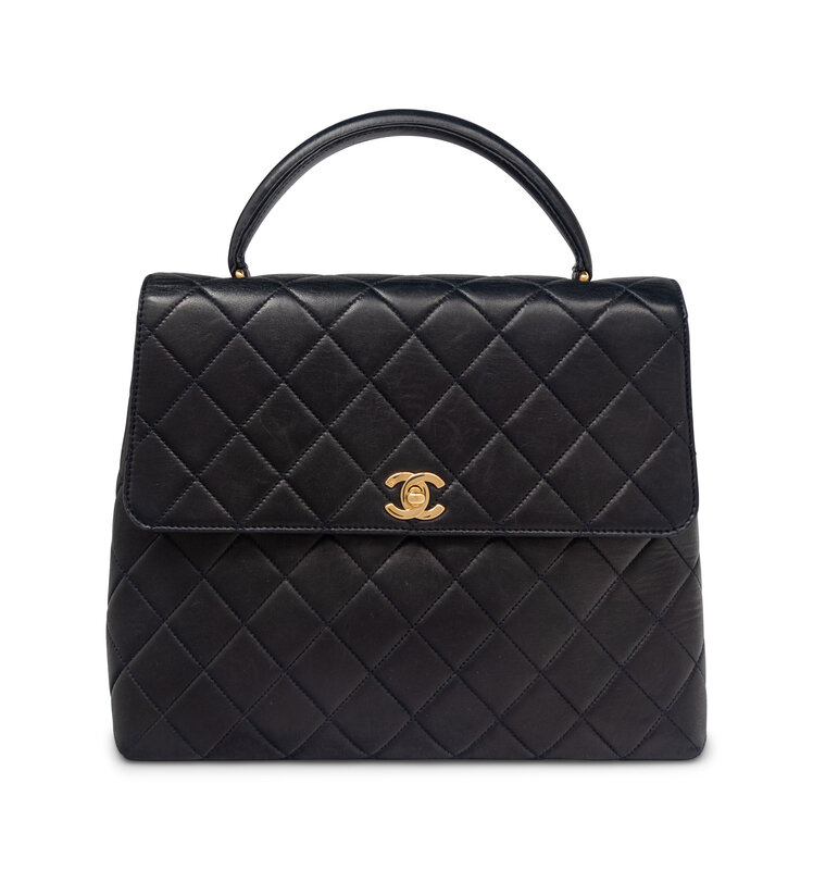 Chanel Single-Flap Top-Handle Bag in Quilted Navy Lambskin with 24K Gold-Plated Hardware. CC Turn-Lock Closure.