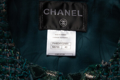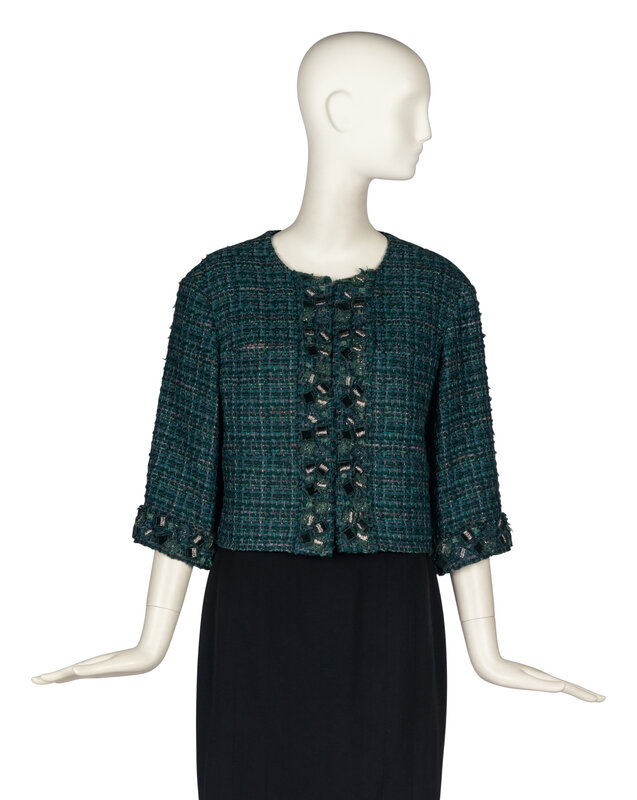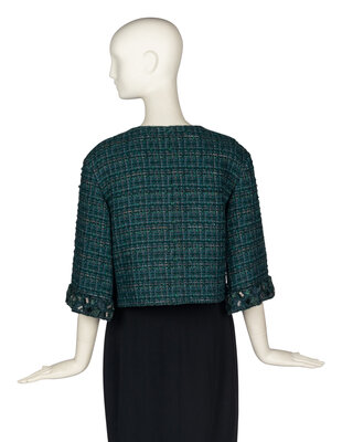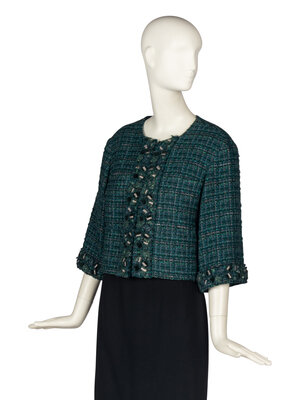 Collarless cropped jacket in teal tweed with metallic thread. 3/4 sleeves. Hook-and-eye closures. Silk lining.