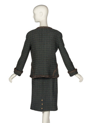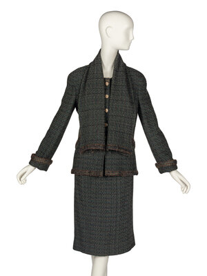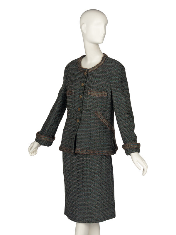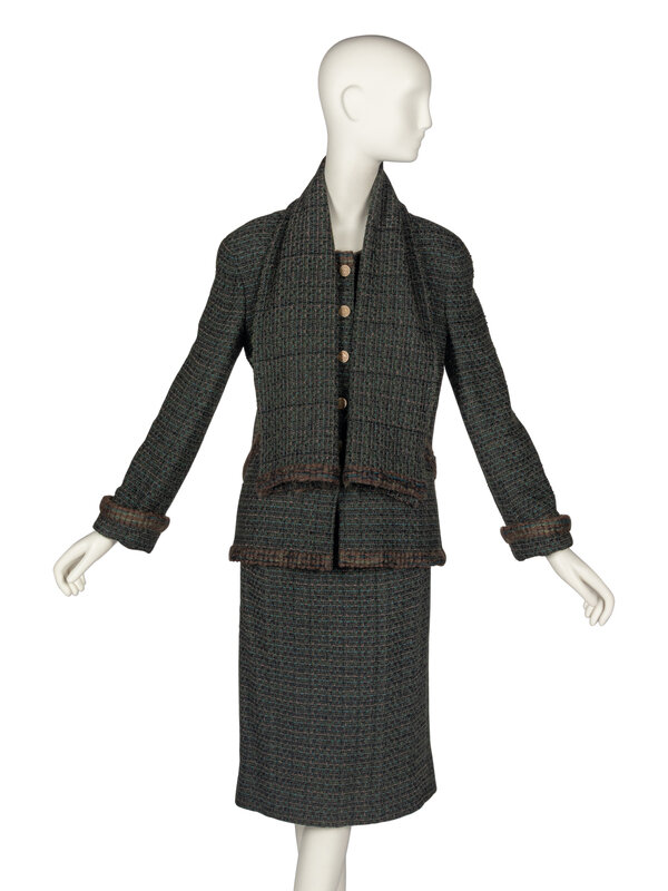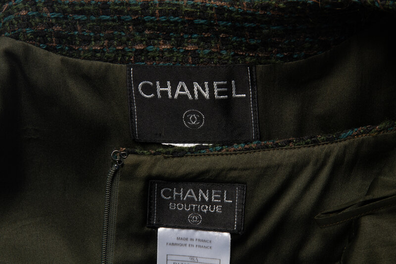 Collarless jacket in multicolor tweed. Metal buttons with interlocking CC logo. Sleeve cuff rolls are sewn and cannot be unrolled. Lined. Includes matching scarf.