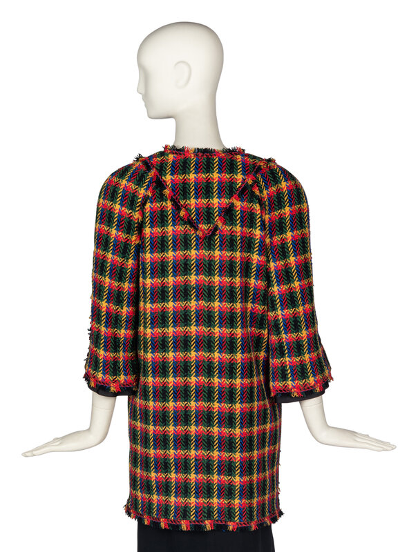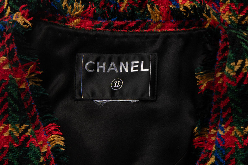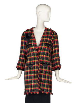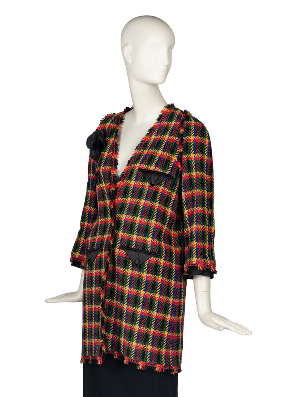 Collarless open-front jacket in multicolor herringbone-tartan bouclé. Decorative non-functional front pockets. Frayed edge trim. Shoulder pads. Silk lining. Includes black camellia brooch. Look 7 from the Fall/Winter 2007 runway collection.