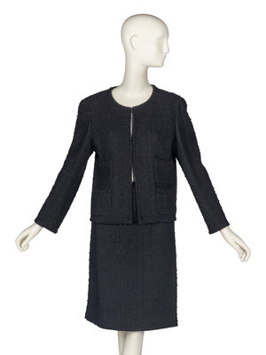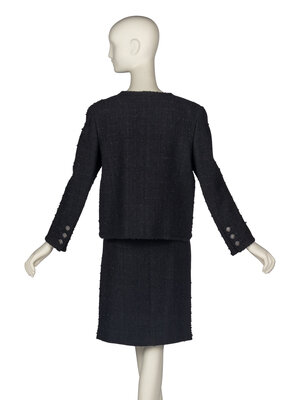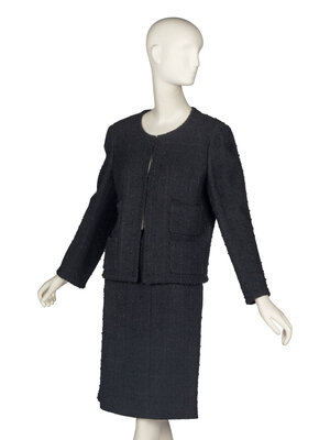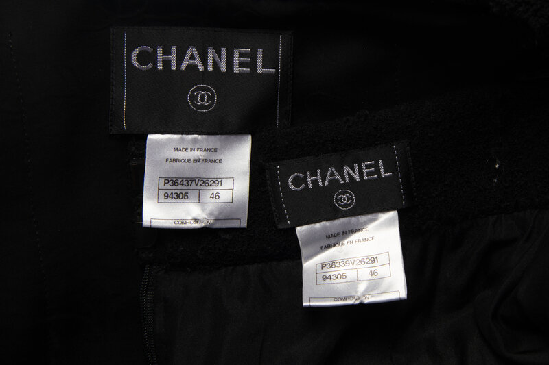 Collarless black bouclé jacket. Hook and eye closures. Four front pockets. Silk lining.