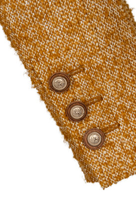Notch-lapel jacket in dark mustard-white bouclé. Two front patch pockets. Wood and metal buttons with Western motifs. Lined. Look 1 from the pre-fall 2014 runway collection, titled "Back in Dallas."