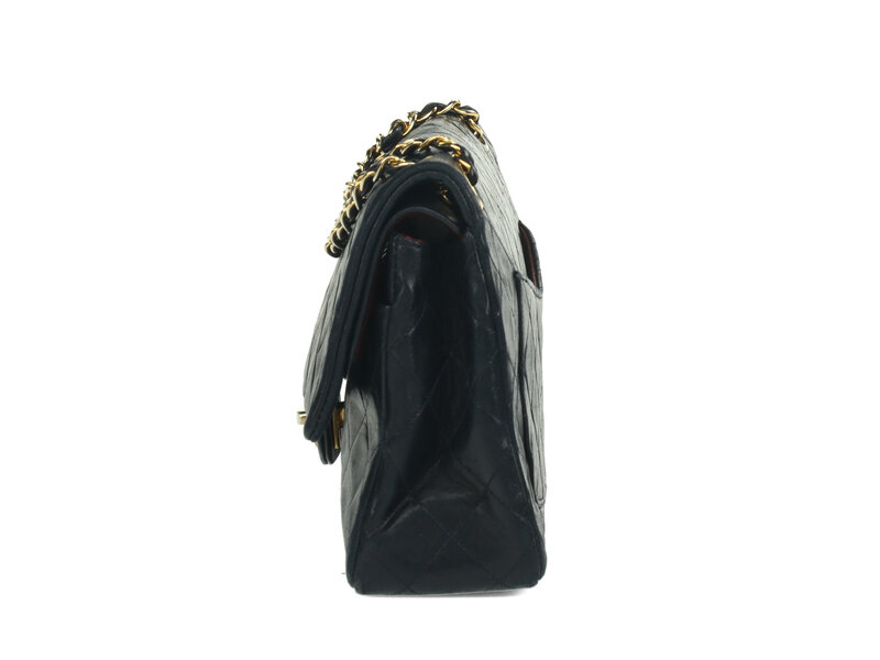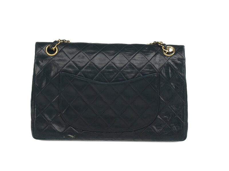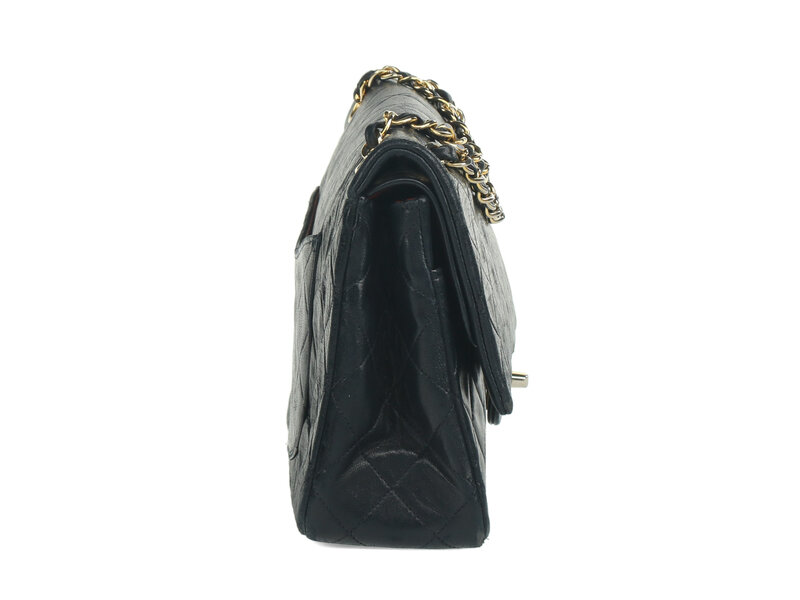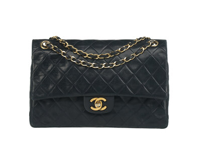 Chanel Medium Classic Double-Flap Shoulder Bag in Quilted Navy Lambskin with 24K Gold-Plated Hardware. CC Turn-Lock Closure and Interwoven Leather-Metal Chain.