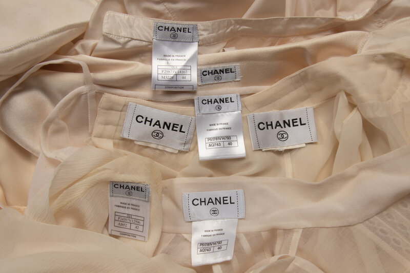 Cream silk blouse in crepe-backed satin. Hammered gold-tone metal buttons with CC logo. Two chest patch pockets. French cuffs.