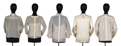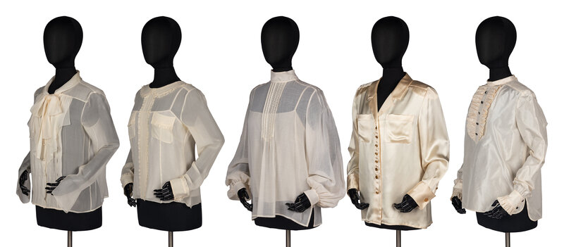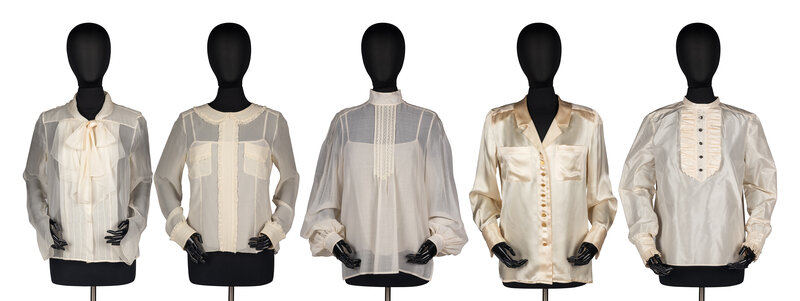 Pussy-bow blouse in off-white silk crepe. Pleated and draped ruffle accents. Faux pearl buttons. Small vents at sleeve cuffs. Sheer. Includes camisole, though the two pieces are not attached and may be worn separately.