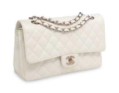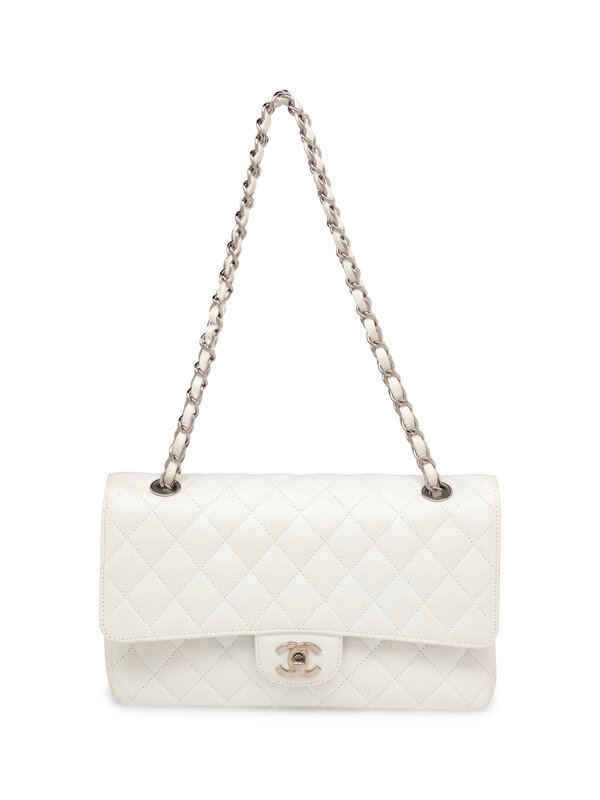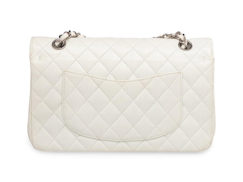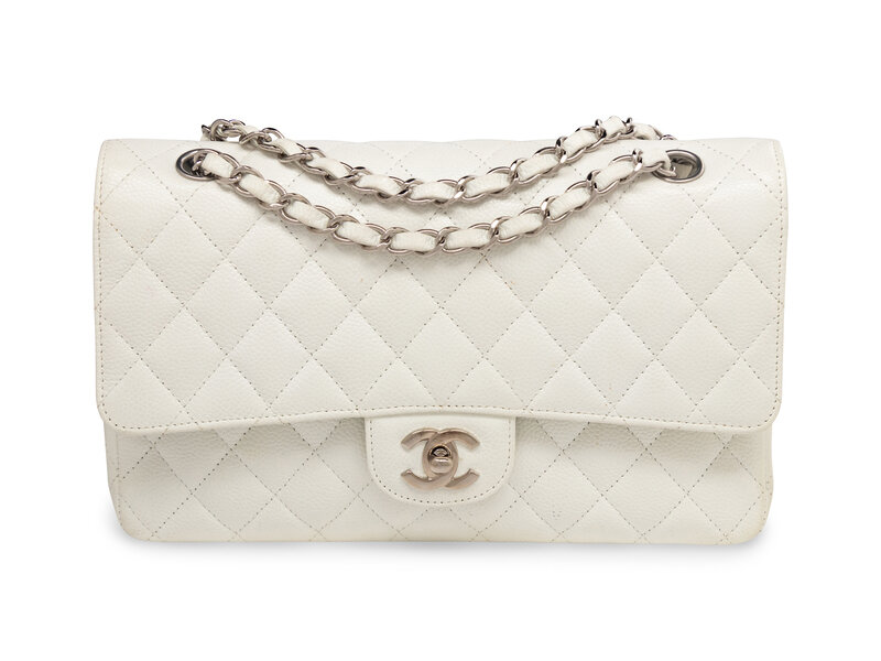 Chanel Medium Classic Double-Flap Shoulder Bag in Quilted White Caviar Leather with Silver-Tone Hardware. CC Turn-Lock Closure and Interwoven Leather-Metal Chain.