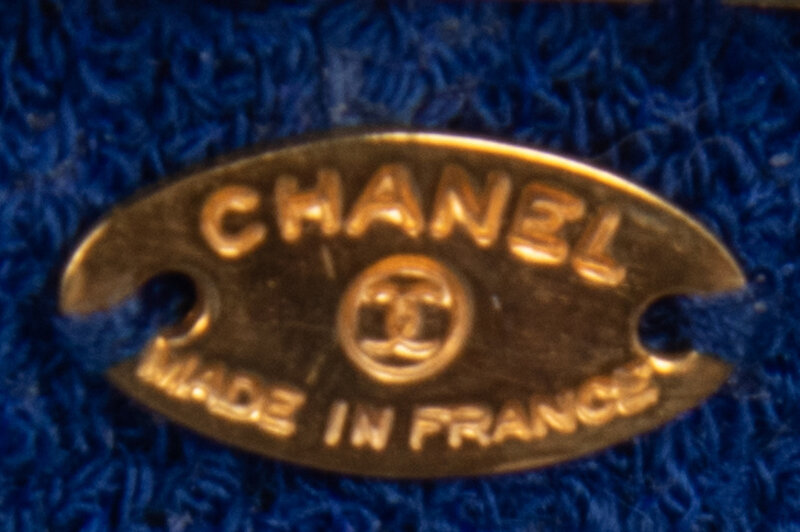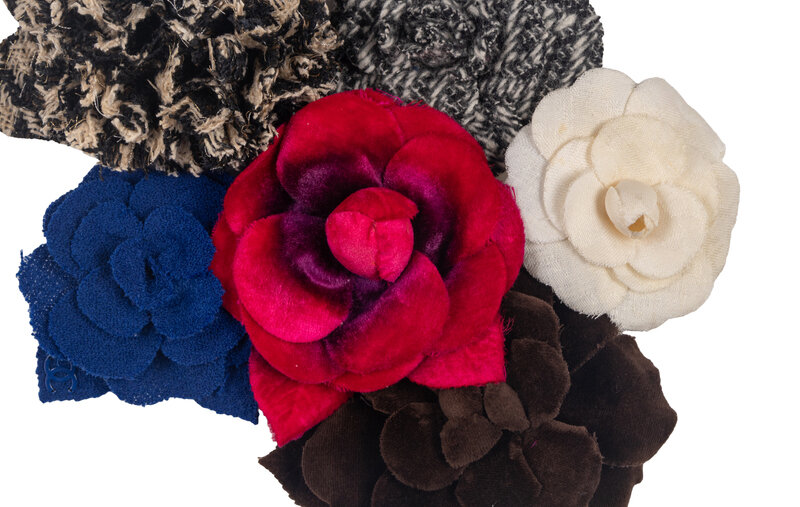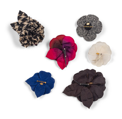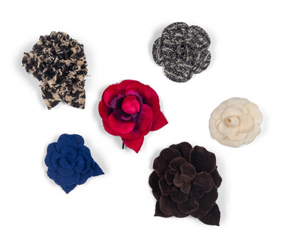 Six camellia flower brooches by Chanel. Pin backs. Magenta velvet, black-and-white tweed, brown velvet, royal blue coated crepe. black-and-white abstract houndstooth rough tweed, coated linen in cream.