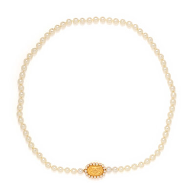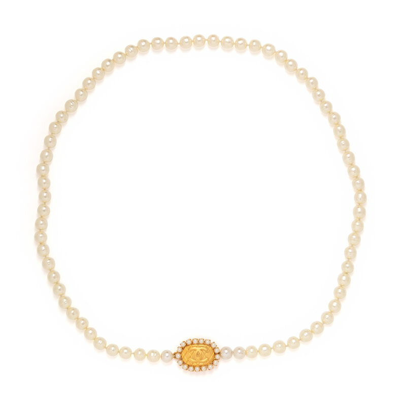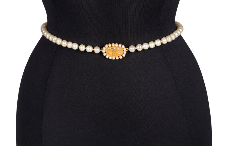 Glass pearl belt with gold-tone metal buckle, engraved with CC logo and quilted pattern. Non-adjustable.