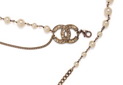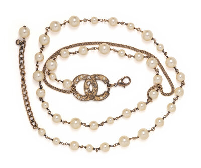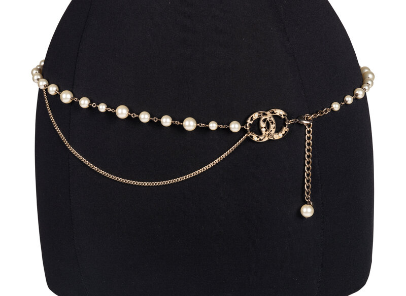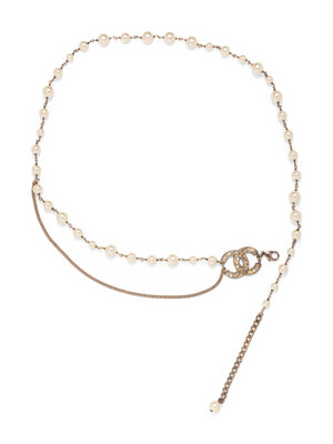 Glass faux-pearl belt with chain accents. CC logo with partial metal fill and additional glass pearls. Adjustable.