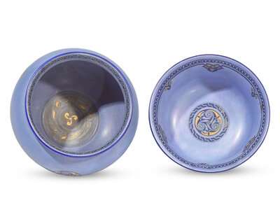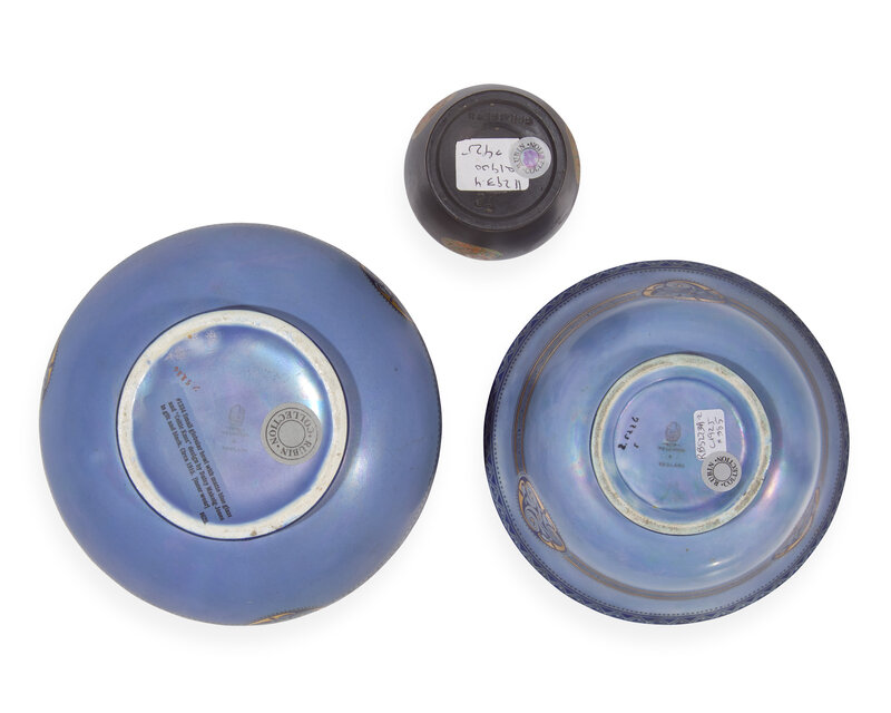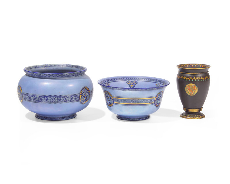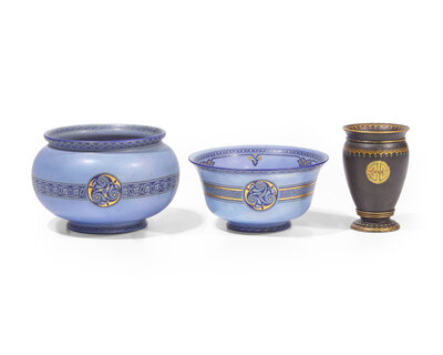 comprising a matte blue-glazed earthenware bowl, a matte blue-glazed globular bowl, and a black basalt vase, all with parcel gilt Celtic decorations; the bowls with printed Wedgwood Portland Vase marks, further inscribed Z5226; the vase impressed Wedgwood/Made in England.