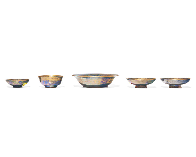 comprising five bowls of various sizes and forms, each with landscape decorated interior and geometric borders.