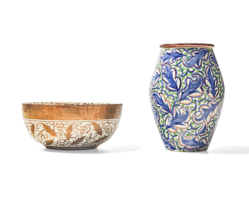 comprising a polychrome decorated vase, impressed Wedgwood and signed with artists' cipher and numbered 2555; and a copper lustre bowl, impressed Wedgwood/Made in England to underside.