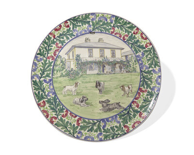 having a wide floral and foliage decorated border surrounding a well decorated with a house and a group of spaniels, each marked with their name: Royalist, Blythe Boy, Bess, Derek and Stormer; impressed Wedgwood to underside, further signed Painted by Alfred Powell for F.L. Thorley Etruria, Feb. 1929.