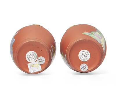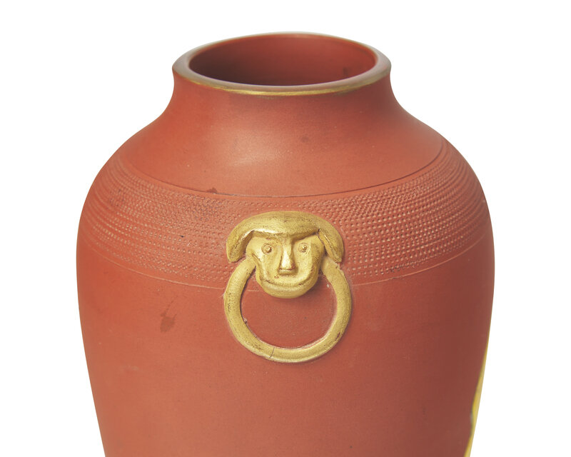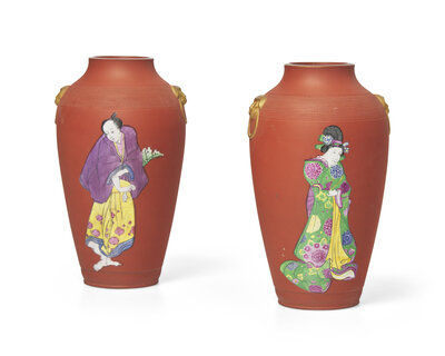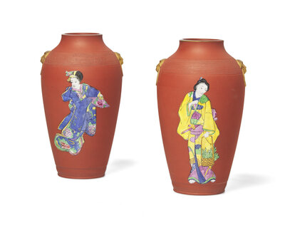 A Pair of Wedgwood Enamel Decorated Rosso Antico Vases