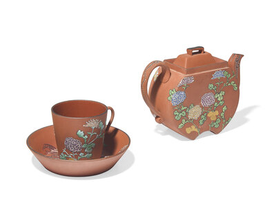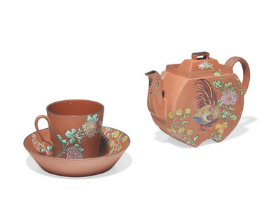 A Wedgwood Rosso Antico Teapot, Cup and Saucer