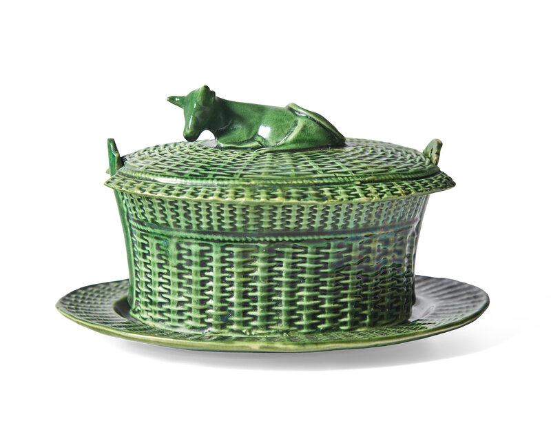 the basket-weave body and cover surmounted by a cow finial; apparently unmarked.