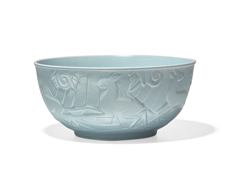 shape 3731, with relief decoration of running deer against an abstract background and a pale turquoise glaze; impressed Wedgwood/Made in England to underside.