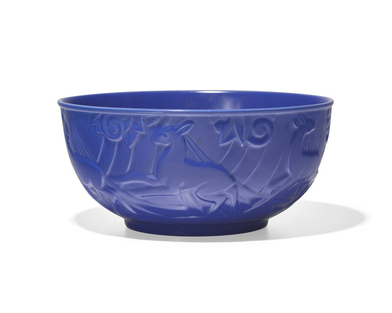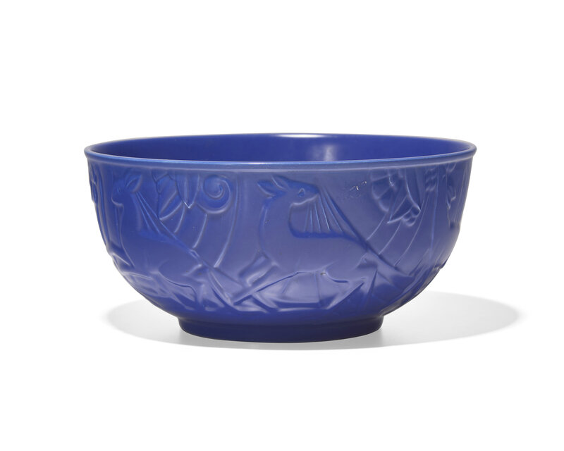 shape 3731, with relief decoration of running deer against an abstract background and a royal blue glaze; impressed Wedgwood/Made in England to underside.