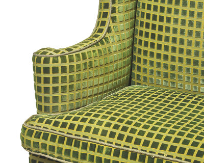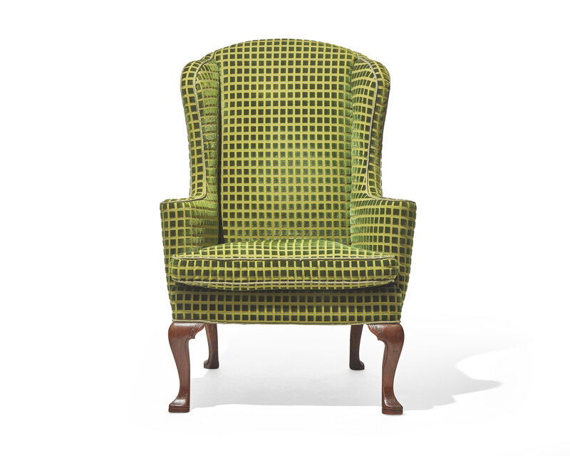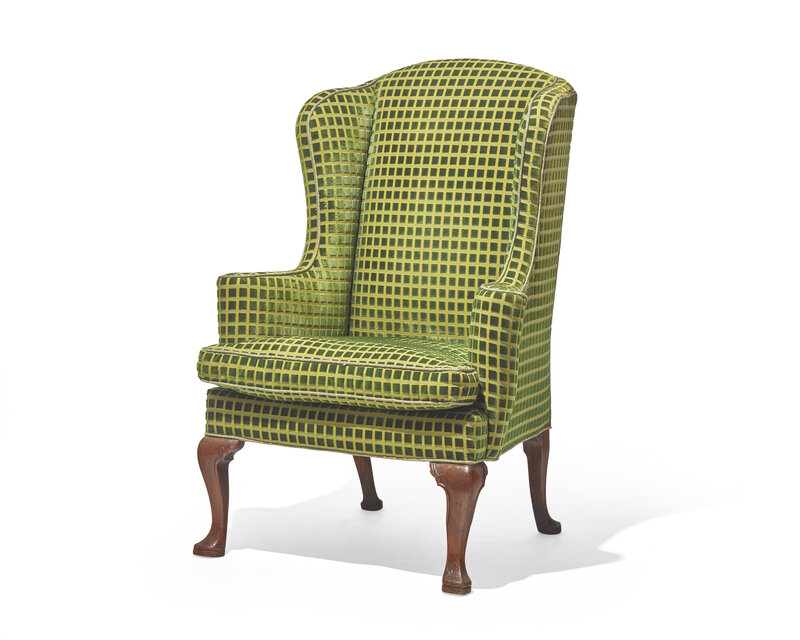 With cabriole legs ending in slipper feet, upholstered in modern green chenille.