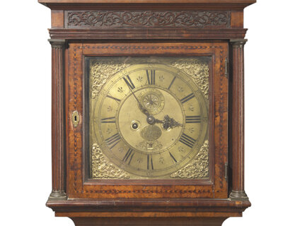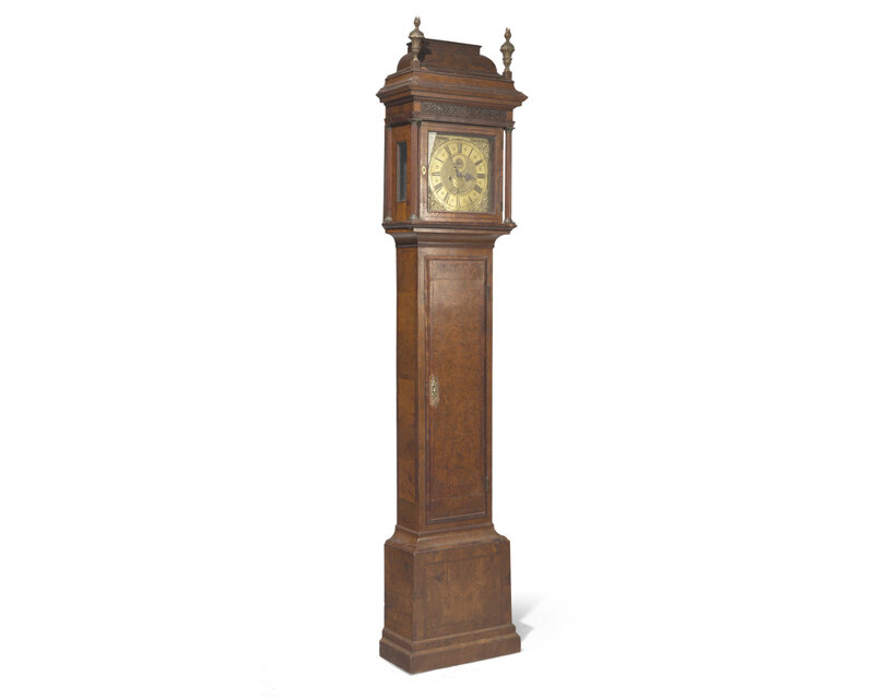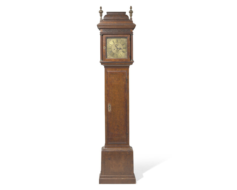 With eight-day movement, the hood with stepped sarcophagus top, two giltwood finials, two fluted columns, and blind fret-carved frieze, the brass face with applied spandrels depicting turbaned masques, the dial engraved, “John Sanderson/ Meemento mori/ Wigton," the case with molded door, on molded base.