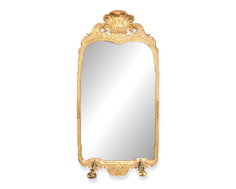 Decorated with typical foliate devices, the top with broken arch pediment centered by large feathered plume, the lower edge with shell, flanked by two detachable brass candle sconces.
