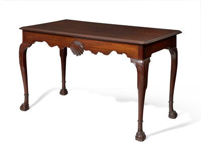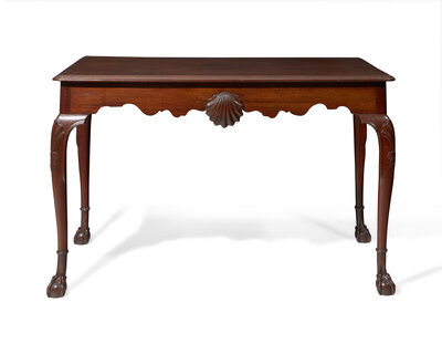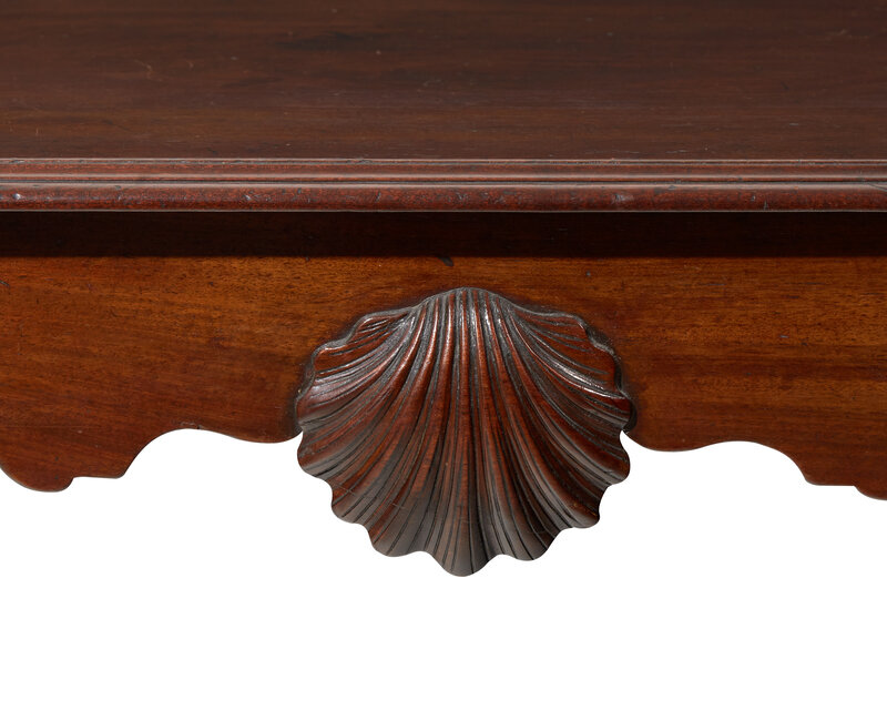 With molded rectangular top, over scalloped apron with carved central front shell, on cabriole legs with shell carved knees, ending in ball-and-claw feet.