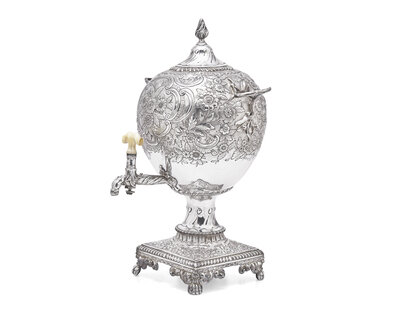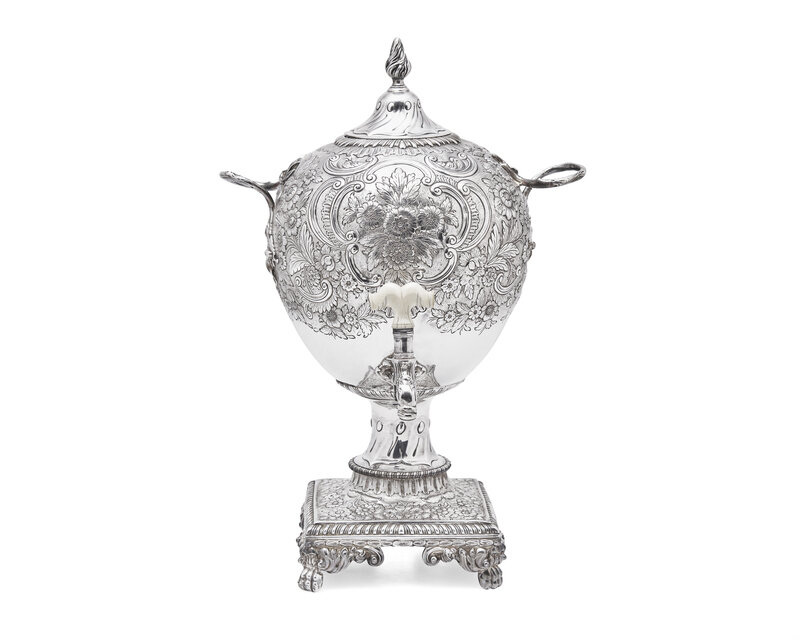 A George III sterling silver floral repoussé hot water urn, maker's mark rubbed, London, 1766