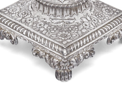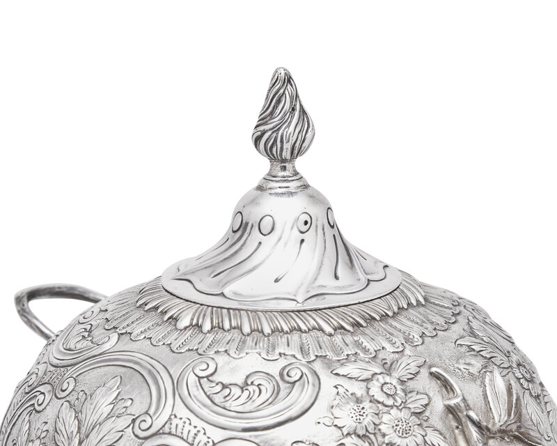 Allover decorated with floral motifs and c-scrolls, with branch-form handles, on square base with paw-form feet, marked to underside; the cover likely not original to the body, marked differently, with maker's mark rubbed.