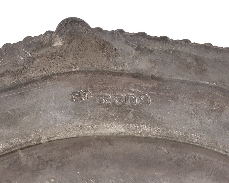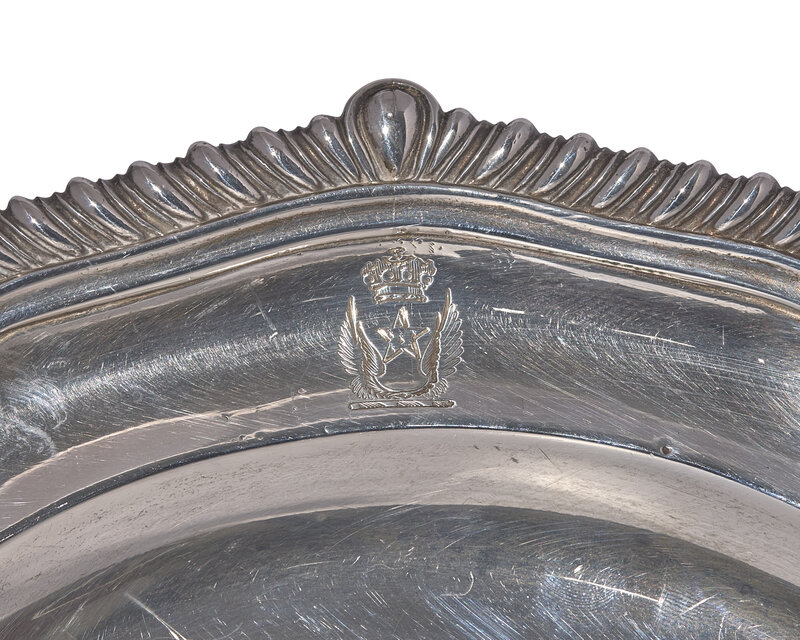 With scalloped and gadrooned rims, each engraved with armorial crest in the form of a crown above winged star, marked.