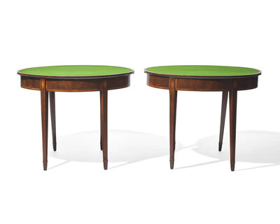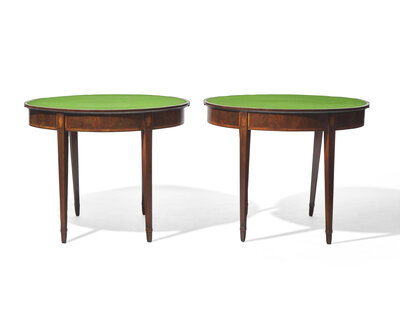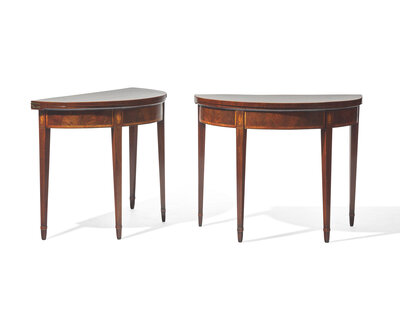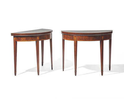 A fine pair of George III inlaid mahogany demilune card tables, circa 1790