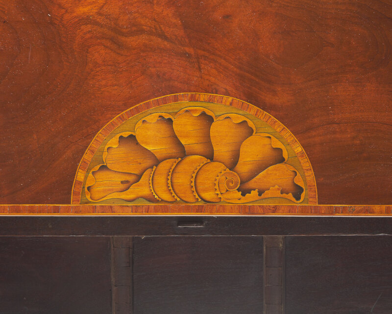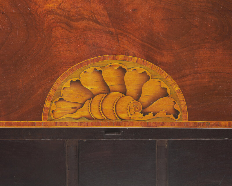 The tops and stiles inlaid with shells, tapered legs with cuffed feet.