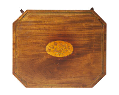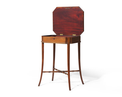 With octagonal lift-lid top revealing interior fitted with compartments, the lid inlaid with central oval reserve containing be-ribboned floral bouquet, on tapered and flared legs connected by H-form stretcher.