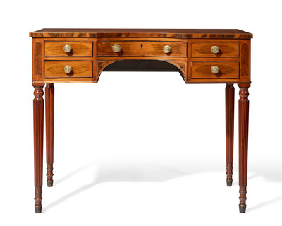 With knee hole, with center drawer flanked by two short drawers on either side, on reeded legs ending in peg feet.