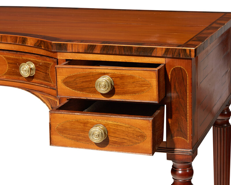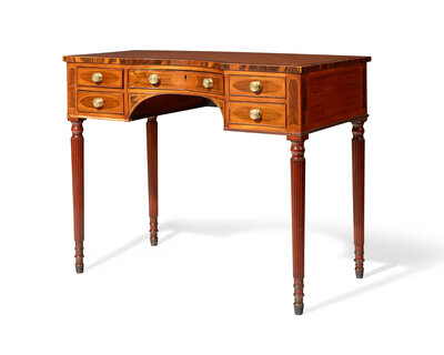 A George III inlaid mahogany, satinwood, and kingwood writing table, circa 1810