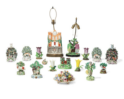A large collection of seventeen Staffordshire figural groups and floral-form spill vases, late 18th and 19th century