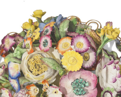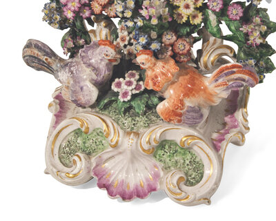 Comprising a castle and couple with tree, both mounted as table lamps; two pairs of bocage candlesticks, one pair with roosters and hens and the other pair with foxes hunting fowl; four various figures or figural groups depicting sheep, woman with hat, and couple with sheep titled "Tenderness"; a spill vase in the form of an elevated castle with sheep below; a reticulated and footed plate with floral arrangement; and four tulip or lily-form spill vases, probably Derby, circa 1825, each unmarked and bearing old accession numbers to the underside and a couple bearing old labels for D.M. & P. Manheim, New York.