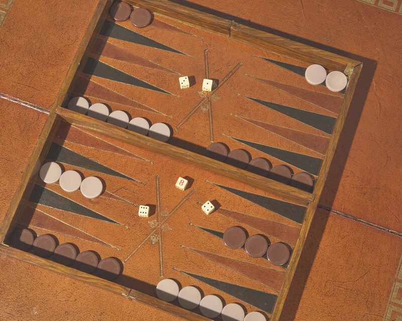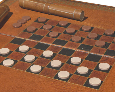 Each with lift tops revealing gilt and embossed leather playing surfaces, accompanied by leather case with game pieces and other accessories, four scrolled legs on paw-form feet.