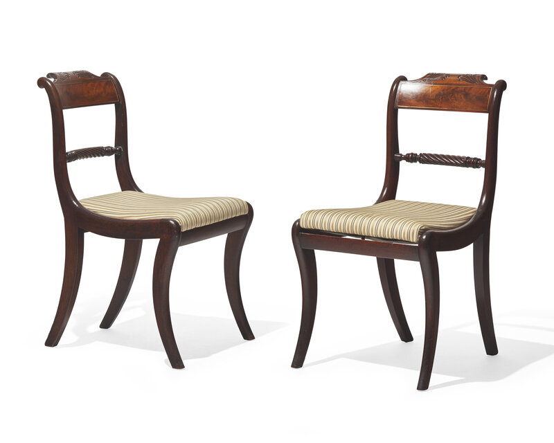 Of typical Klismos form, with carved and brass-inlaid crest-rails, rope-turned backrests, on downswept legs.