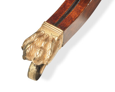 With round flip-top, on four downswept legs connected by medial support, ending in brass paw-form feet with casters.
