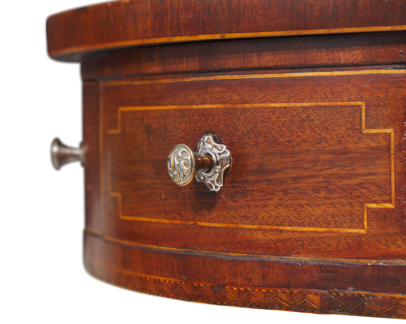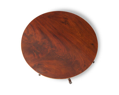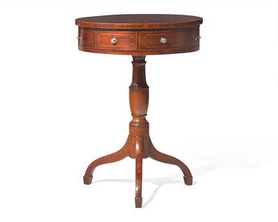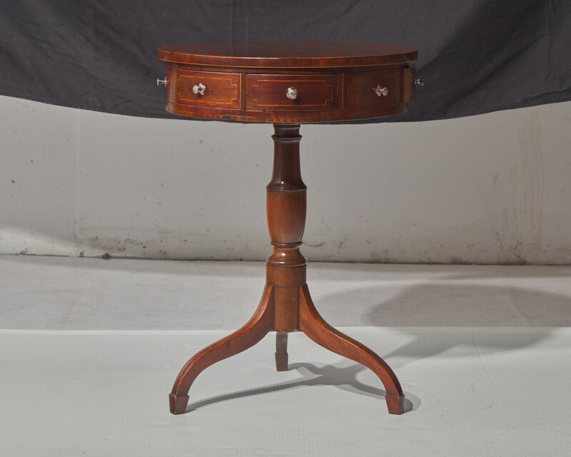 With round top over four drawers and four faux drawer fronts, on pedestal support with three down-turned legs ending in spade feet.