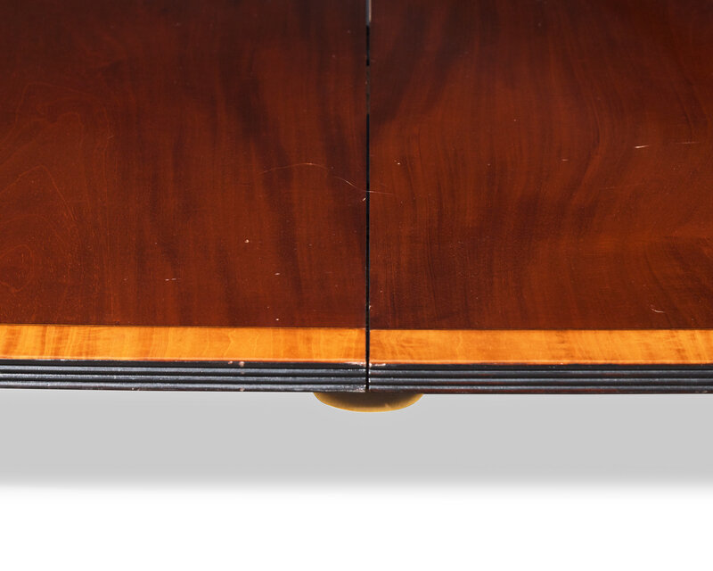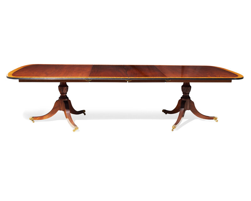 A Regency style two-pedestal inlaid mahogany and satinwood dining table, 20th century