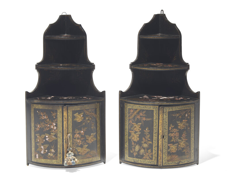 Each with tiered shelves above two japanned doors decorated with birds among flowering trees.
