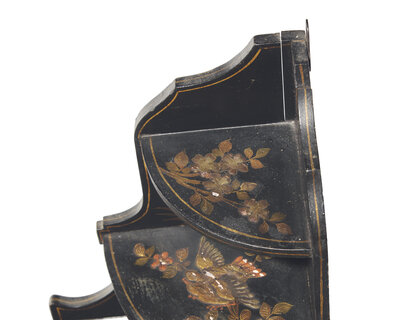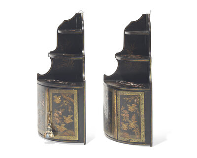 A pair of diminutive Regency style japanned hanging corner cupboards, 19th century