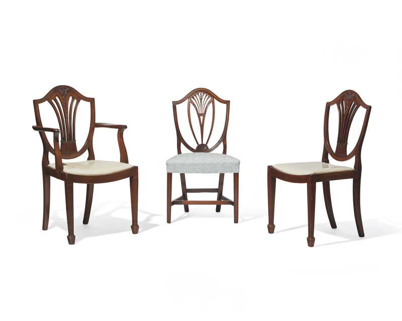 Comprising a set including four armchairs and four side chairs, probably 19th century, with pierced splats carved with wheat motif, with downswept seat frames, slip seats upholstered in white vinyl, fluted and tapered legs ending in spade feet, and a pair of side chairs with pierced splats, circa 1800, with over-upholstered seats with modern fabric, on tapered and molded legs connected by H-form stretchers.