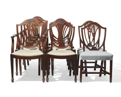 An assembled group of ten George III shield-back carved mahogany dining chairs, 18th / 19th century
