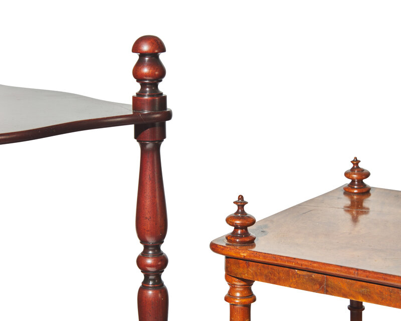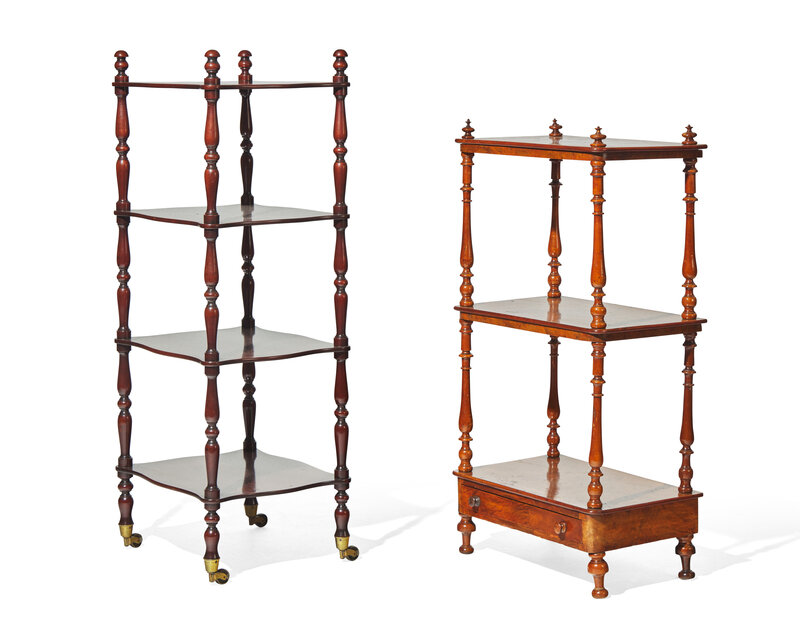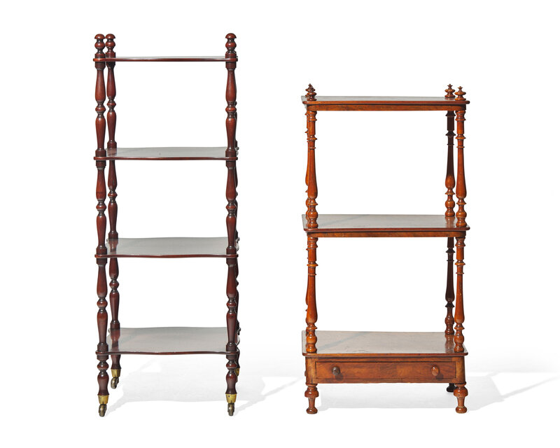 The first example in mahogany, with four shelves, turned posts, on brass casters, the second example in burl walnut, with three shelves and lower drawer, turned posts, bun feet.