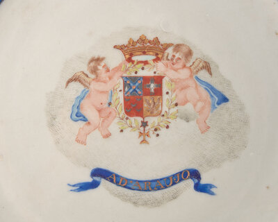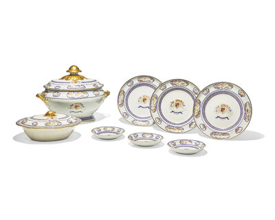 All decorated with armorial crest flanked by two putti and surmounted by crown, with bannerette below inscribed, "Ad Araujo," with gilt accents, and small reserves bearing bucolic scenes with fishermen, farmers with cows, and deer, comprising a covered tureen, a covered entree dish, two soup plates, a plate, and three saucers, the undersides bearing accession numbers, 79.500.14-1, 2, 5, 6, 7, 8, 9, and 10, and labels with old Winfield Foundation accession numbers.