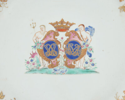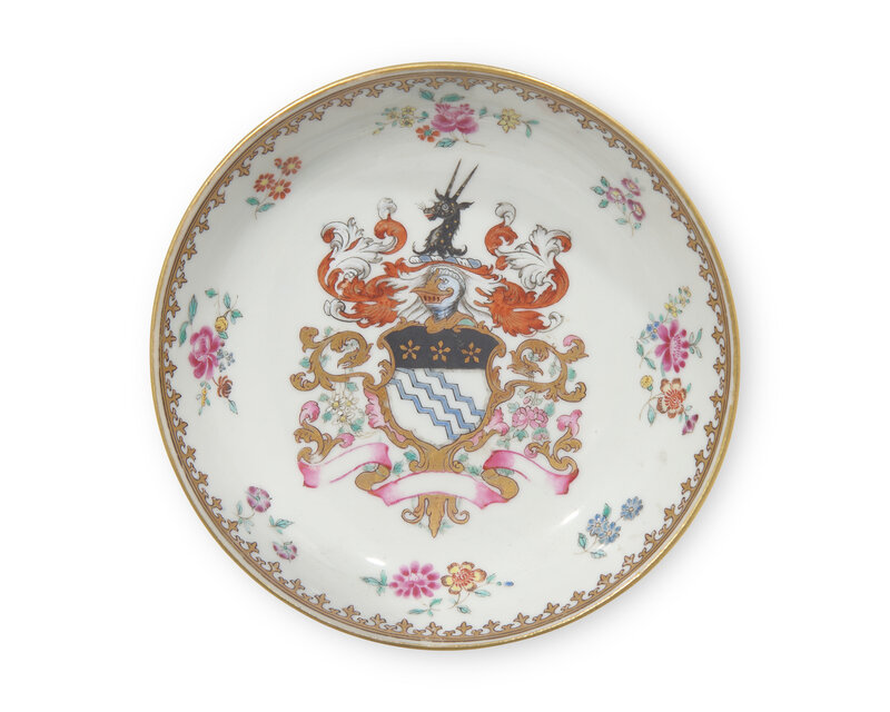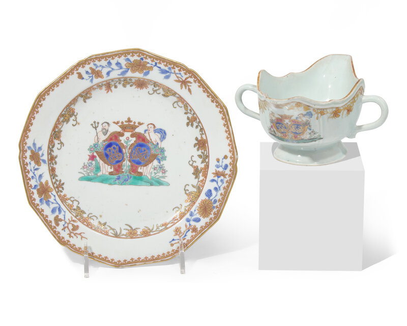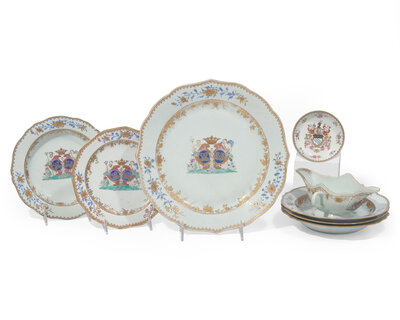 All with double armorial cartouche flanked by Neptune and Venus, unidentified arms, and enamel and gilt floral sprays, comprising a two-handled sauceboat, a charger, a small plate, and four soup bowls, the undersides inscribed with accession numbers 79.500.13-1, 2, 3, 4, 5, 6, and 7, and labels with old Winfield Foundation accession numbers; sold together with a single saucer, possibly made for the Scandinavian Market, circa 1750-1760, decorated with an armorial crest surmounted by an antelope head, the underside bearing accession number, 79.500.17-1, and label with old Winfield Foundation accession number. (8 items total).