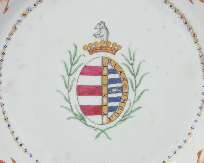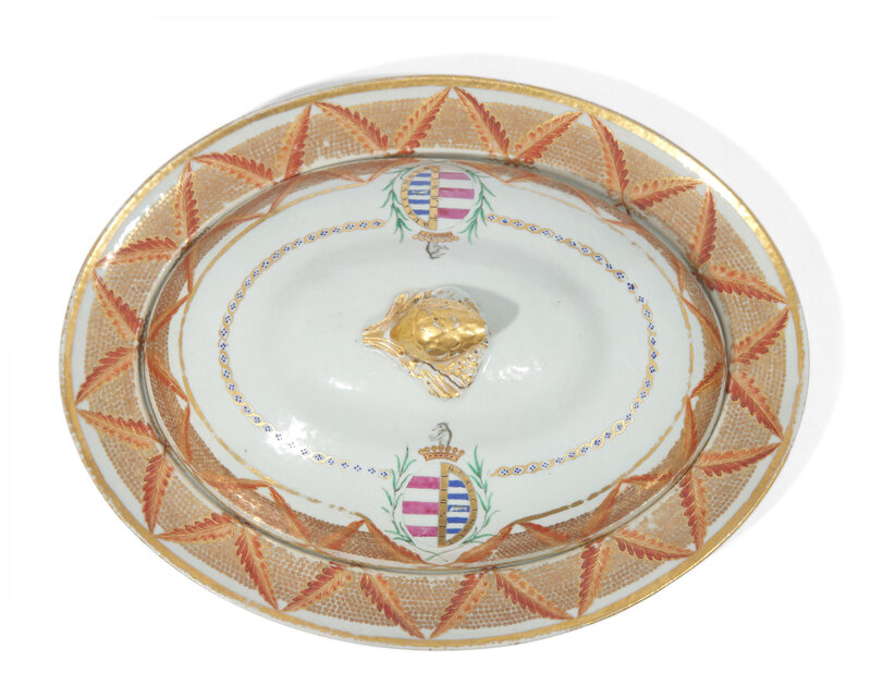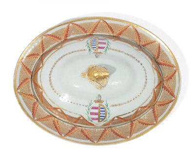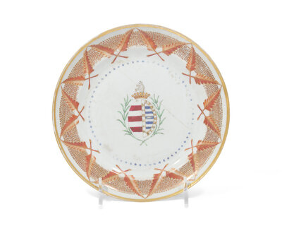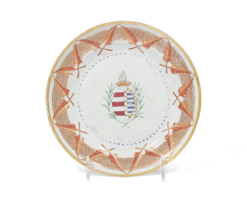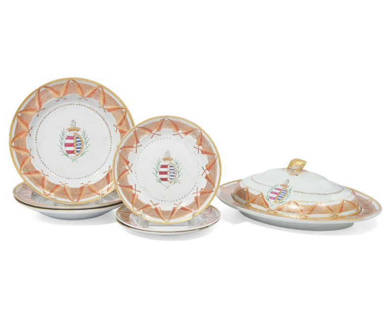 All decorated with armorial crest in the form of an oval reserve containing stripes and motto, "Findit Quascumquae," flanked by laurel twigs and surmounted by gray bear within crown, the rim gilt and decorated with orange feather pattern, comprising a covered platter, three soup plates, and three plates, the undersides bearing accession numbers, 79.500.8-1, 2, 3, 4, 5, 6, and 7, and labels with old Winfield Foundation accession numbers.